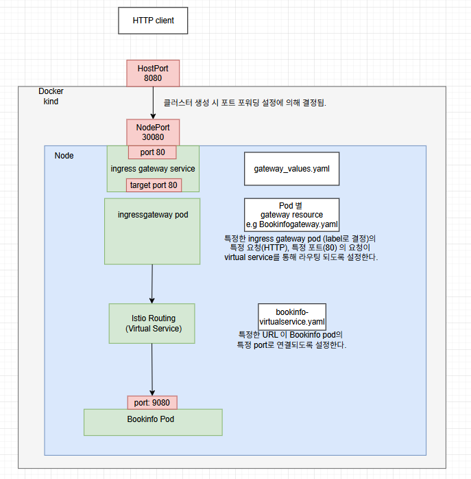 먼저 도커 컨테이너 형태로 클러스터(kluster)를 생성한다. 일반적인 쿠버네티스 클러스터는 단일 제어 평면(istio 제어 평면과는 구분된다)과 여러 개의 노드(node)로 구성되지만, kind는 일반적으로 로컬 개발 및 테스트가 목적이므로 단일 노드로 구성된다. 또한, 컨테이너 형태로 도커 상에 배포되기 때문에, 클러스터 내부와 외부 간 통신을 위해선 배포 시점에 컨테이너 포트포워딩 설정이 필요하다.